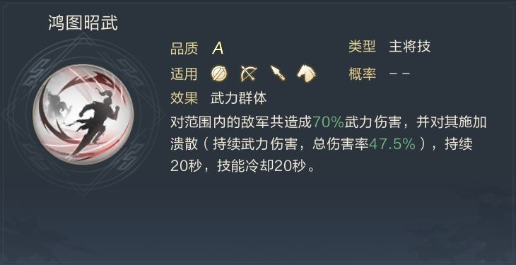 “鸿图昭武”——范围武力伤害+DPS伤害。范围性的伤害再加上持续性的伤害,虽然主公的主将技和自带技比起来,不是那么的出色,不过在游戏前期还是不错的技能。