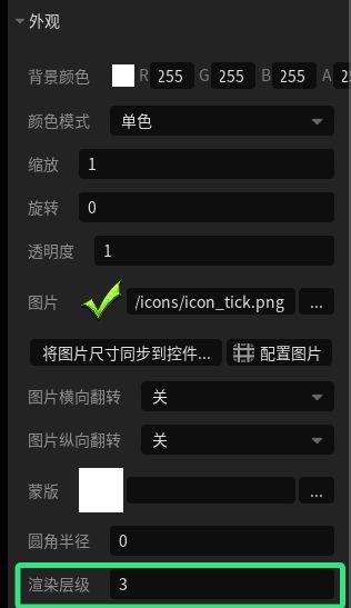 接着创建卡牌所需的各个组件(具体我第一期笔记有讲),这里可以再在卡牌上覆盖一个“上阵图标”的标识,主包懒用ps画图就顺手用了绿钩图标,可不要学我偷懒哦。这里要记得在属性面板里调高渲染层级让它显示在顶端。(P3)