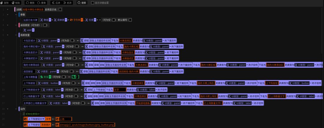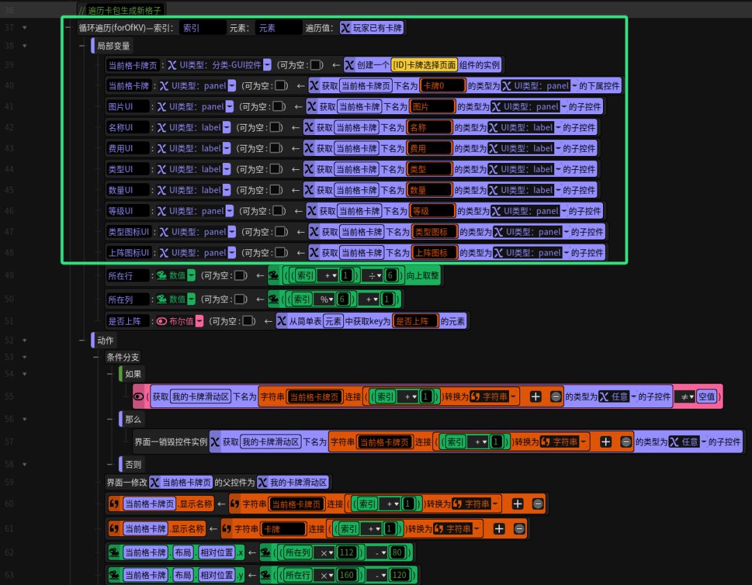 接着编写遍历卡牌包生成新卡牌格的逻辑。这个方法需要传一个参数,那就是上一期中服务端逻辑中将要传给客户端的玩家拥有卡牌的信息,是一个由简单表构成的数组。那么让我们遍历这个数组,就可以获取数组中每一张卡牌的信息。在这个循环中,要先在局部变量中创建一个卡牌选择页面组件的实例,这样这个循环每遍历一次,就会创建一个我们前面在界编中配置好的“卡牌选择页面”。然后,我们在局部变量中获取卡牌页面中的各个子控件,就能做到每遍历一次数组,就能取到该次遍历创建的组件实例中各个UI控件信息(P6)