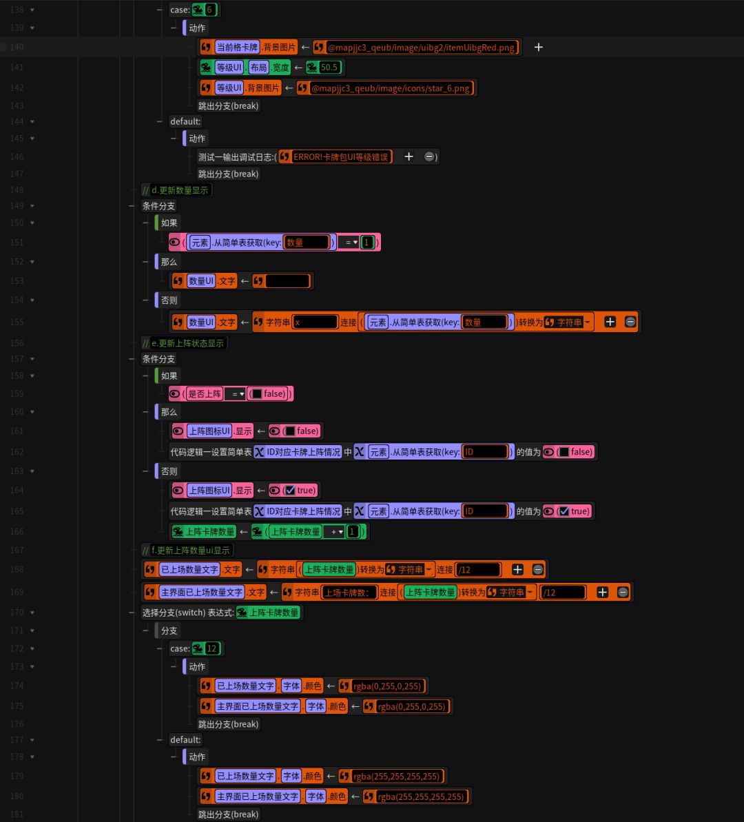 然后写修改控件属性的逻辑。先调整控件格的相对位置,再分别更新卡牌UI中图片、名称、费用等方面的UI显示。此外,还要根据卡牌类型和卡牌星级等属性分情况讨论卡牌的UI显示。(P7-8)