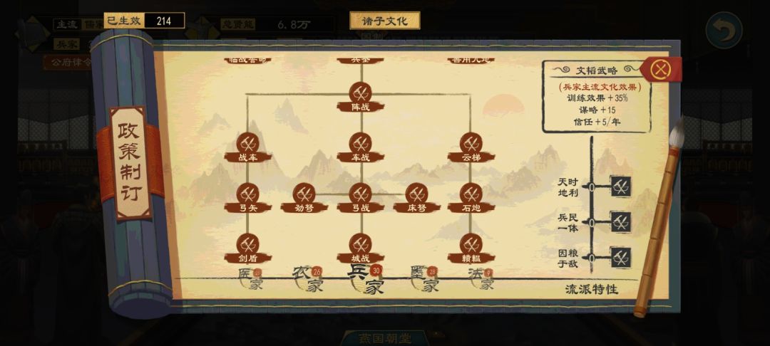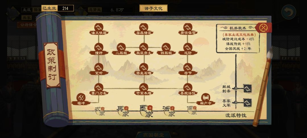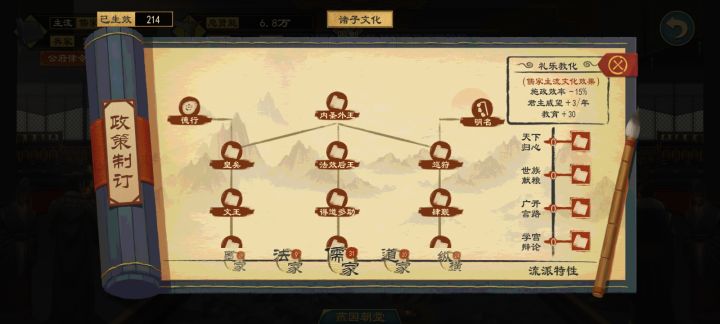 我这里用的是开局的儒家主流文化,硬生生的把其他文化策略都点都差不多,所以在这里我想说其实没必要转主流文化,太麻烦了,而且你转文化之后你已经点完的主流文化策略都会不见了,要重新弄。