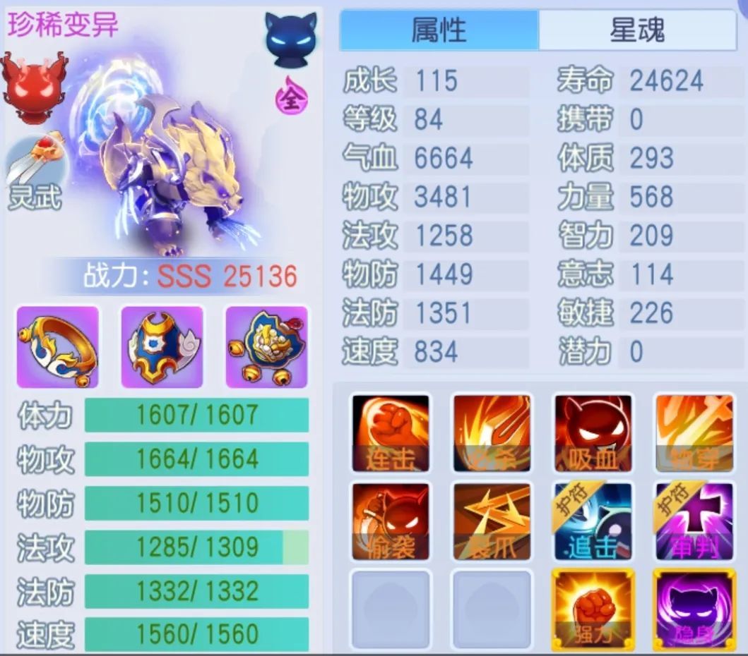 宠物属性属性以力量为主,物攻近3500,速度840,生存能力尚可,气血6600。