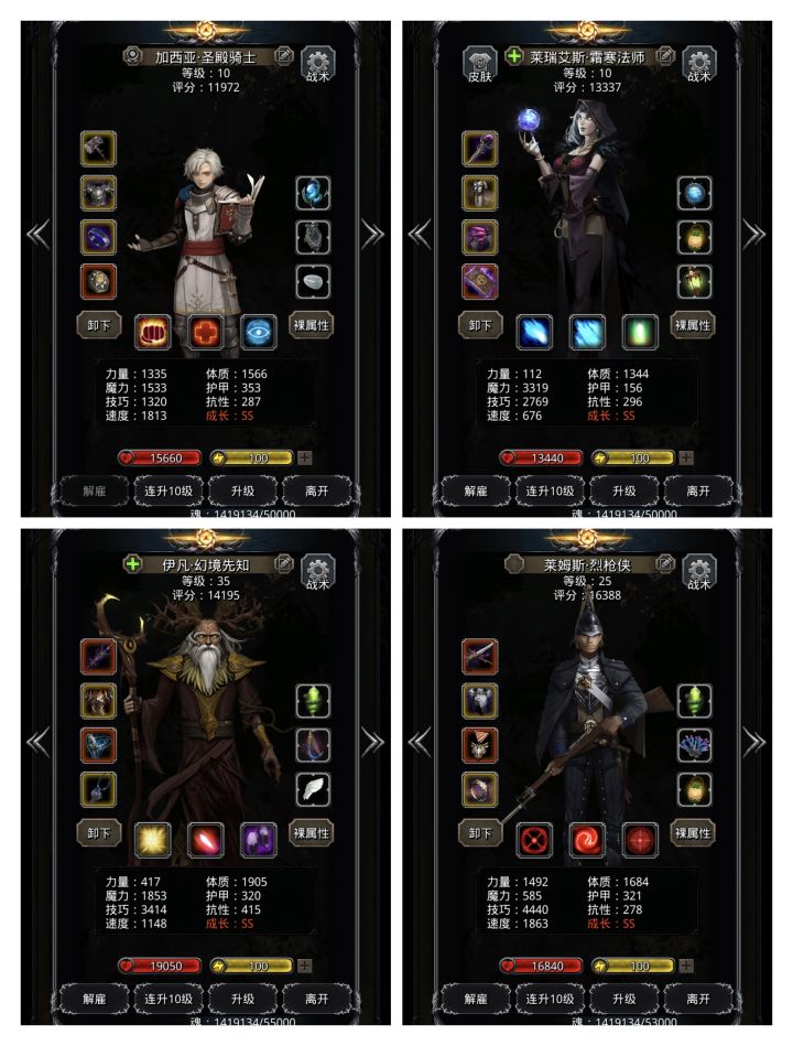 属性如上图,幻境技巧再低个300-400也不影响,最左边是独裁枪,第二是冰法带的先发,第三是幻境(不用先发),第四就是圣殿。