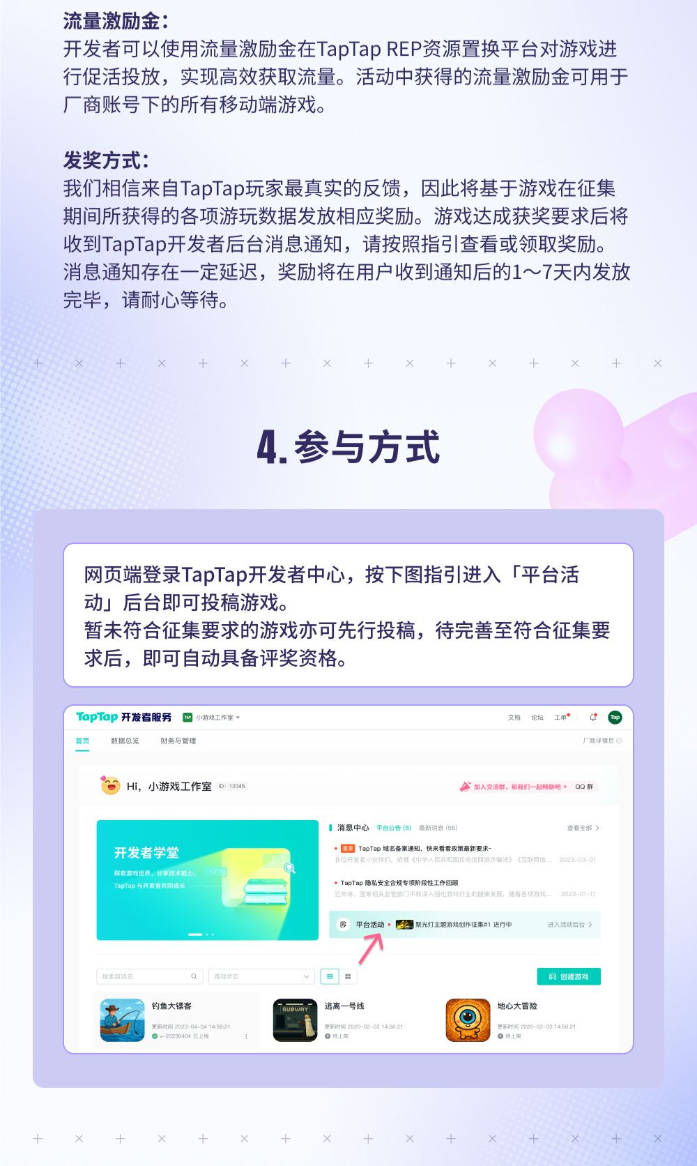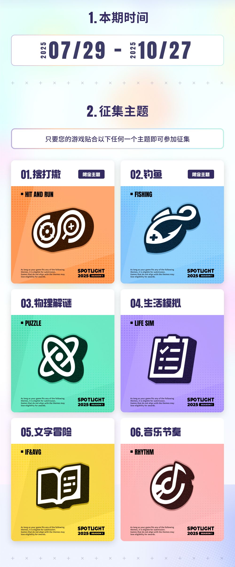 「主题游戏创作征集」将是每期约 3 个月的常驻活动,参加者可以在征集期间任何时间点投稿游戏,一旦达成表现里程碑将立即解锁包括流量激励金、站外平台投放曝光机会等等多项权益。