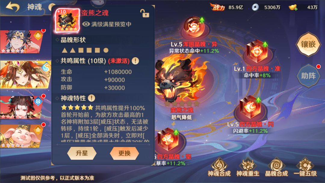 而激活蛮熊之魂则可以对敌方攻击力最高的神将造成负面效果,并同样可提升己方装备了该神魂神将的基础属性。