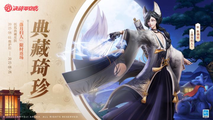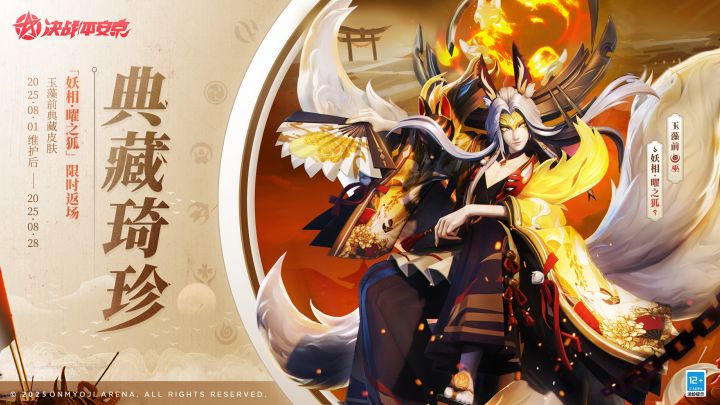 8月1日维护后-8月28日,玉藻前典藏皮肤「妖相·曜之狐」、妖狐典藏皮肤「落月归人」、荒典藏皮肤「山雨空明」限时返场,活动期间,可在[达摩降福]-[琦珍]使用达摩币兑换。