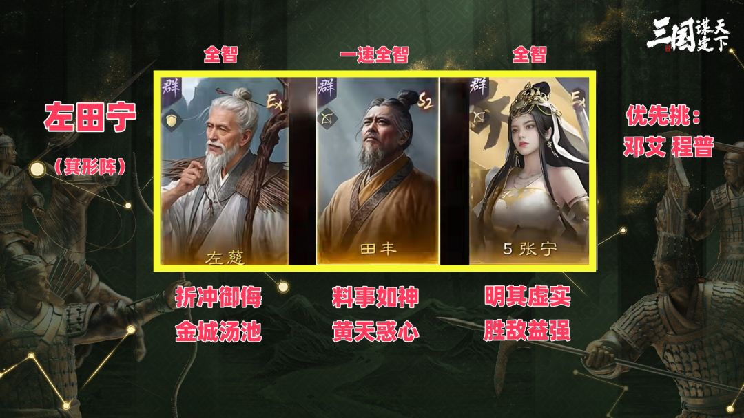 22级左右可以开7级地,用左田宁(左慈+张宁+田丰)阵型为箕形阵,左慈带折冲御侮+金城汤池,加点全智。张宁带明其虚实+胜敌益强,加点全智。田丰带料事如神+黄天惑心,加点20先攻全智。