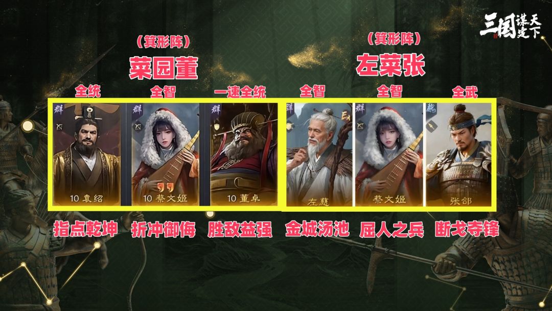 到了10级可以换菜园董(袁绍+董卓+蔡文姬)阵型为箕形阵,袁绍带指点乾坤,加点全统。董卓带胜敌益强,加点一速全统。蔡文姬带折冲御侮,加点全智。优先挑刘烨去打!