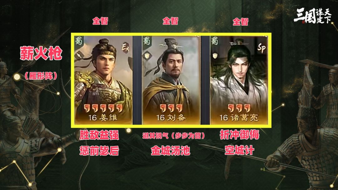 最后是一个比较特殊的队伍薪火枪(姜维+刘备+SP诸葛亮)它可运用于整个开荒阶段,例如5级地、8级地、9-12级地,能用到的地方很多。该队伍的阵型为雁形阵,姜维带胜敌益强+惩前毖后,加点全智。刘备带避其锐气(步步为营)+金城汤池,加点全智。SP诸葛亮带折冲御侮+空城计,加点全智!