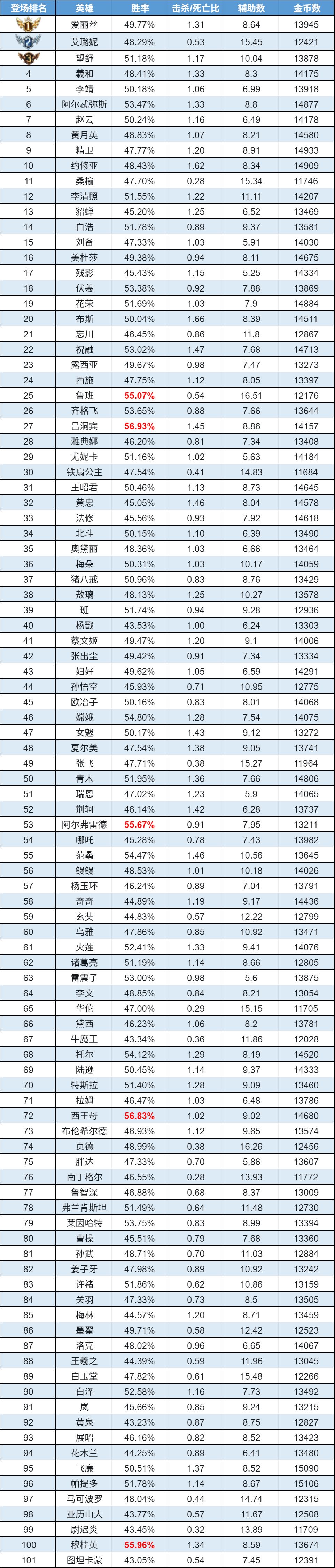 排序:按登场率高低排序,标红为胜率前5