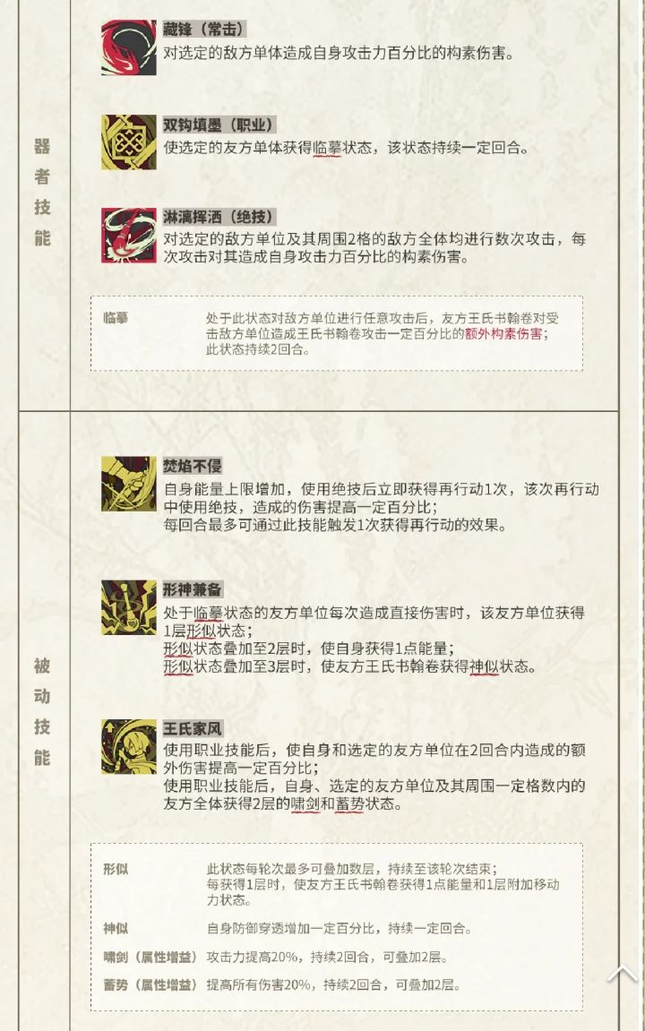 被动二:职业技能选定的友方单位,直接攻击一次为王氏书翰卷补充一点能量和移动力,两次自身能量➕1,三次附加一定防御穿透。