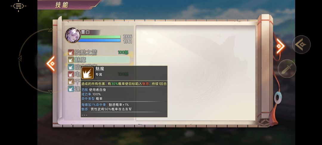 被动技能:魅魔(超强控制)所有形式攻击有概率魅惑(使用普通攻击攻击随机敌人,敌人只有一个时概率自残)敌人,(命中越高概率越大),以及被动开局所有敌人分别有50%几率沉默(不能释放技能和大招), 你没看错这两个都是被动触发,打boss专用,再也不用担心扛不住boss的攻击啦