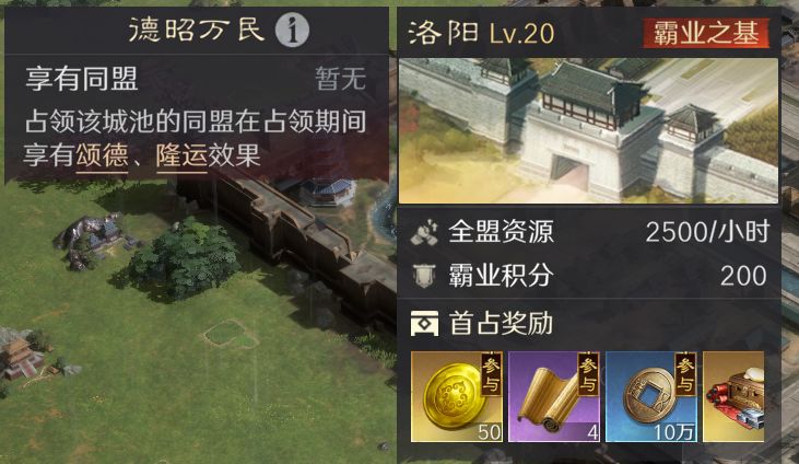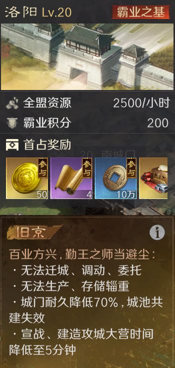 2. 「颂德」:占领期间,本同盟每10小时永久增加10点霸业积分。需要注意的是,每座城池计分有上限,即同阵营的同盟之间换城积分不会重复增加,「洛阳」、「寿春」、「长安」200分计满即停(满分需要8.33天),「邺城」、「襄阳」150分计满即停(满分6.25天)。