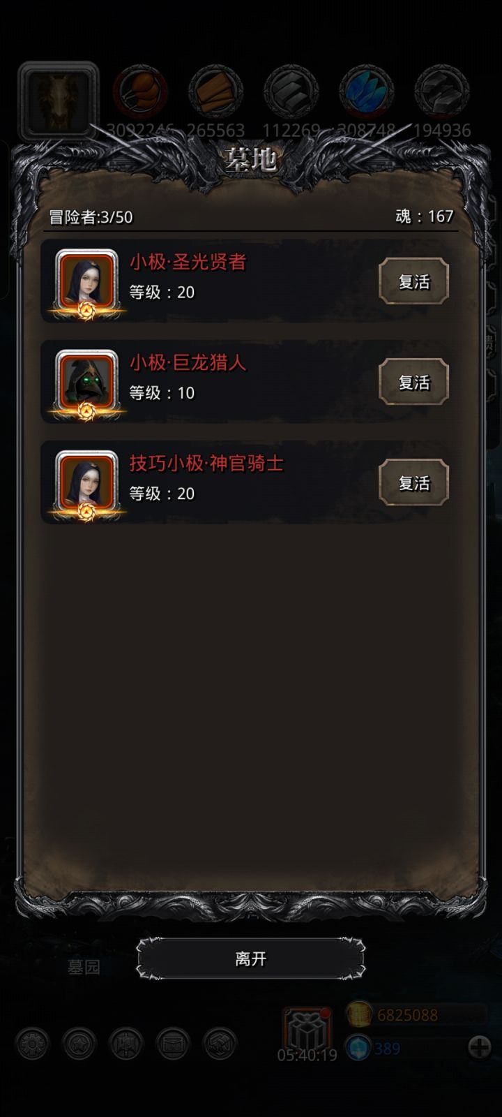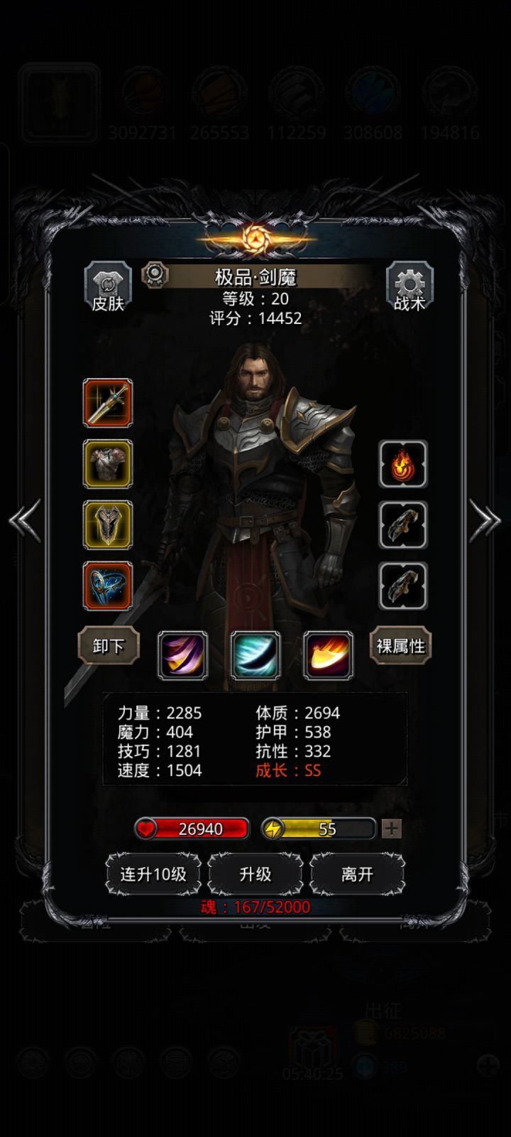 最后只能捡起最老的剑魔打法,独裁进去送了,手残了没给圣光加上甲暴毙,神官抗性低扛不住魔攻下一回合也暴毙,最后剑魔给力直接单挑过了。(等我刷一下魂把那三个拉起来再放配置)