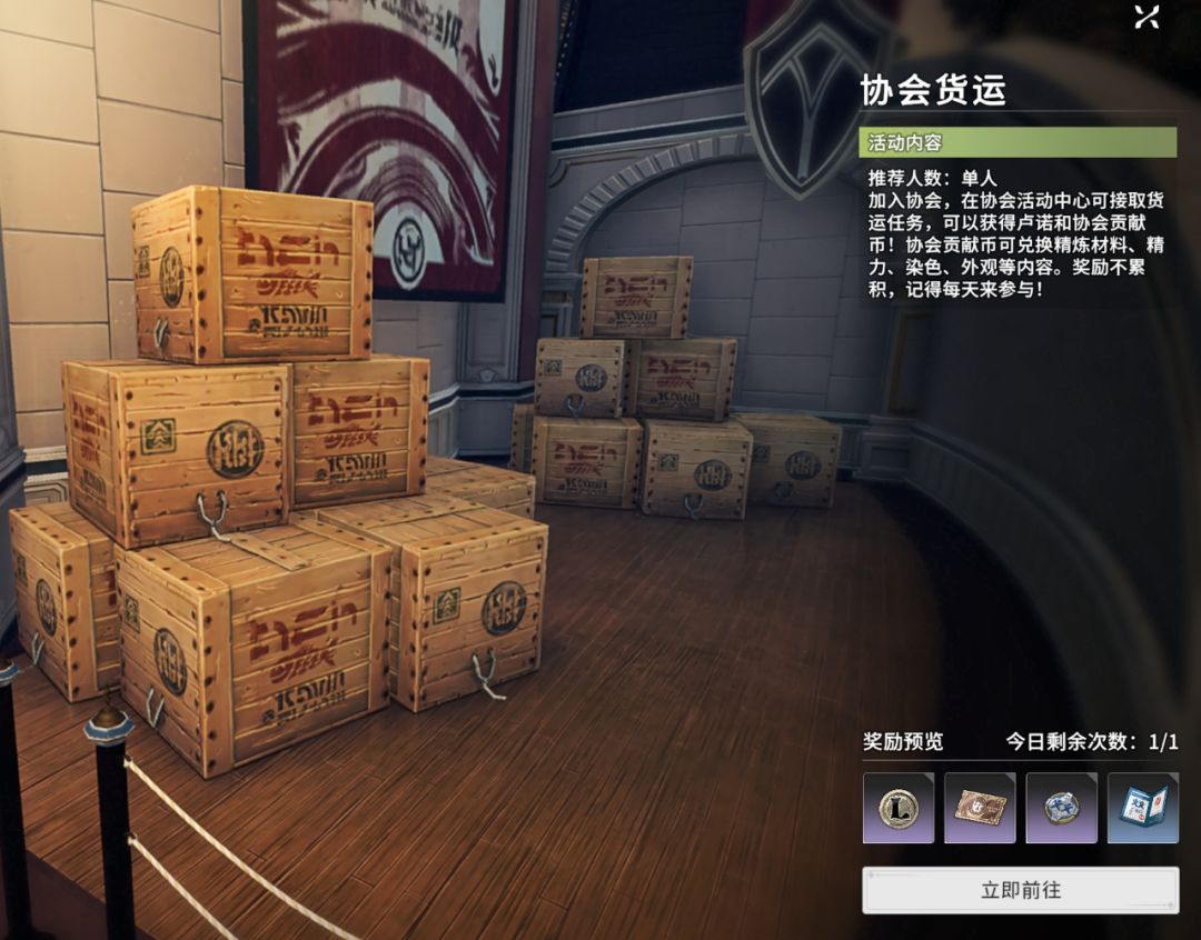 协会货运:前提条件,我们需要加入到协会当中,在协会活动中心可以接取货运任务,主要是以获取卢诺和贡献币为主,感兴趣的玩家记得要每天参与。