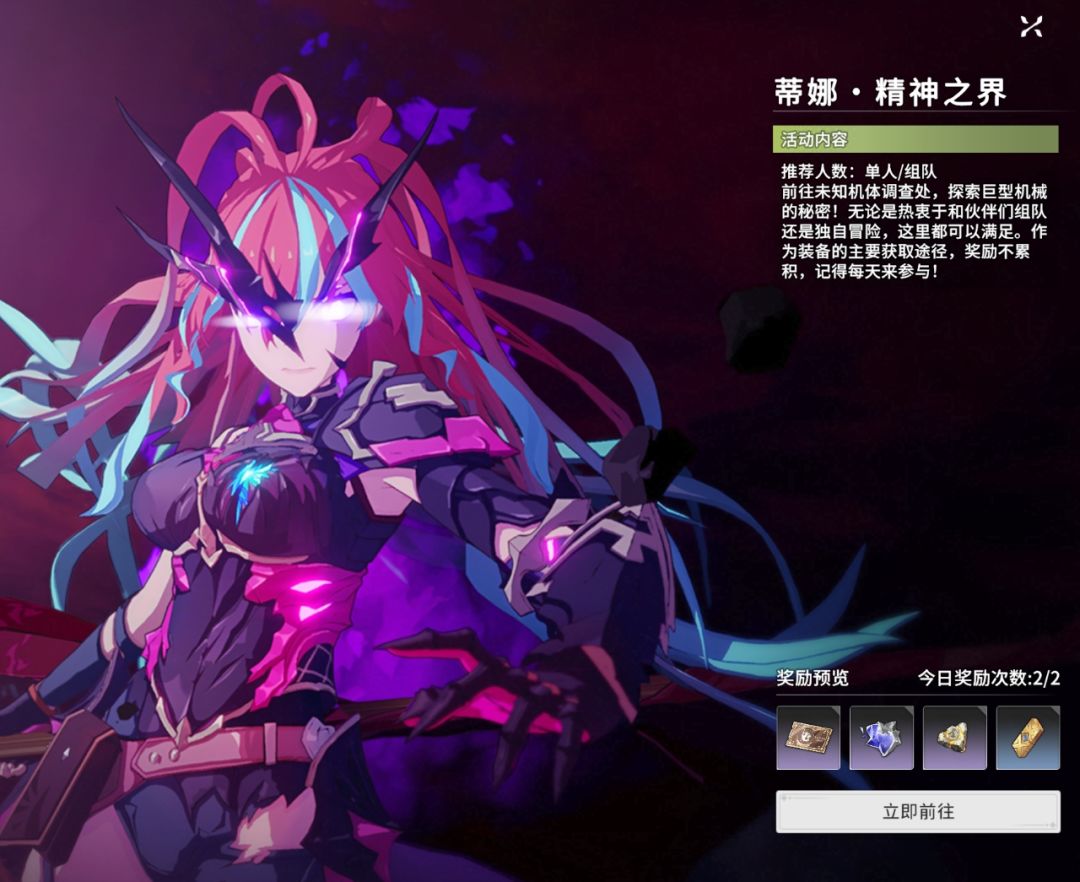 不稳定空间:游戏中玩家获得装备的主要获取途径,与其他每日任务相同,奖励不累积,需要每天来参与。该项活动可以单人进行,也可以和同伴们一起组队参与。能够获得的奖励有合金碎片和重铸石,是获取和提升装备方面战力的必需品。