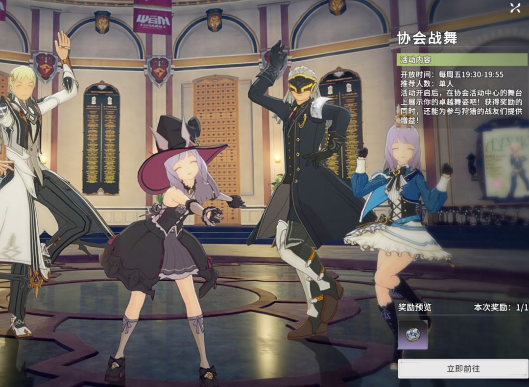 协会战舞:每周的活动开启之后,在协会活动中心的舞台上进行展示,同时也可以为参与狩猎的战友提供增益。