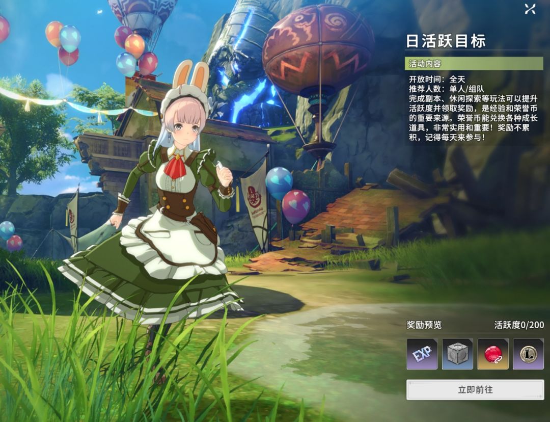 日活跃目标:可以获得经验,荣誉币和蔷薇宝石的奖励型任务。该项任务以提升每日的活跃度为目标,提升活跃度的方法有很多种类,可以完成副本休闲探索以及完成不同的任务来提升活跃度,日活跃目标是经验和荣誉币的重要来源。