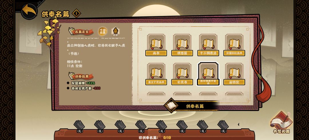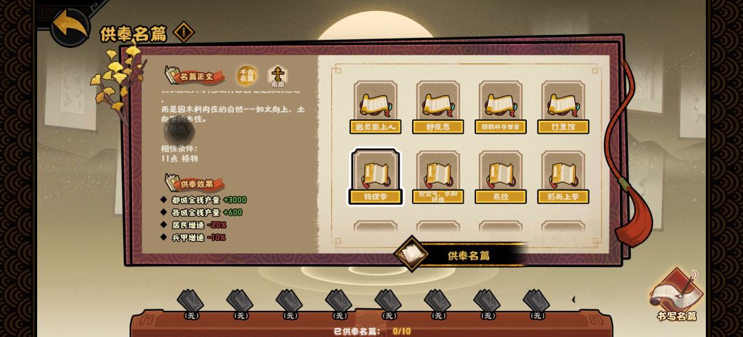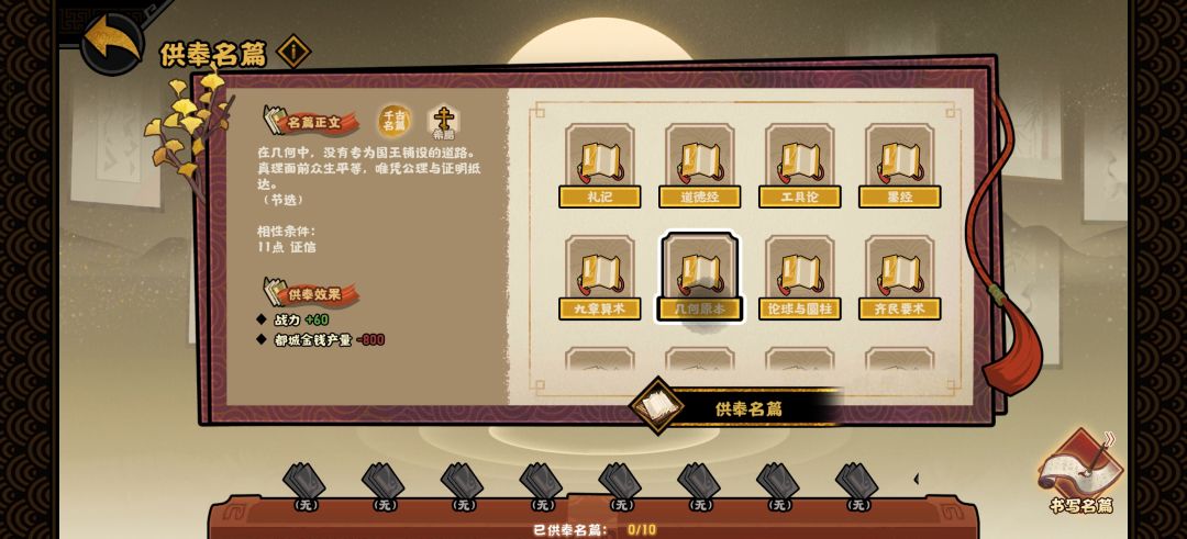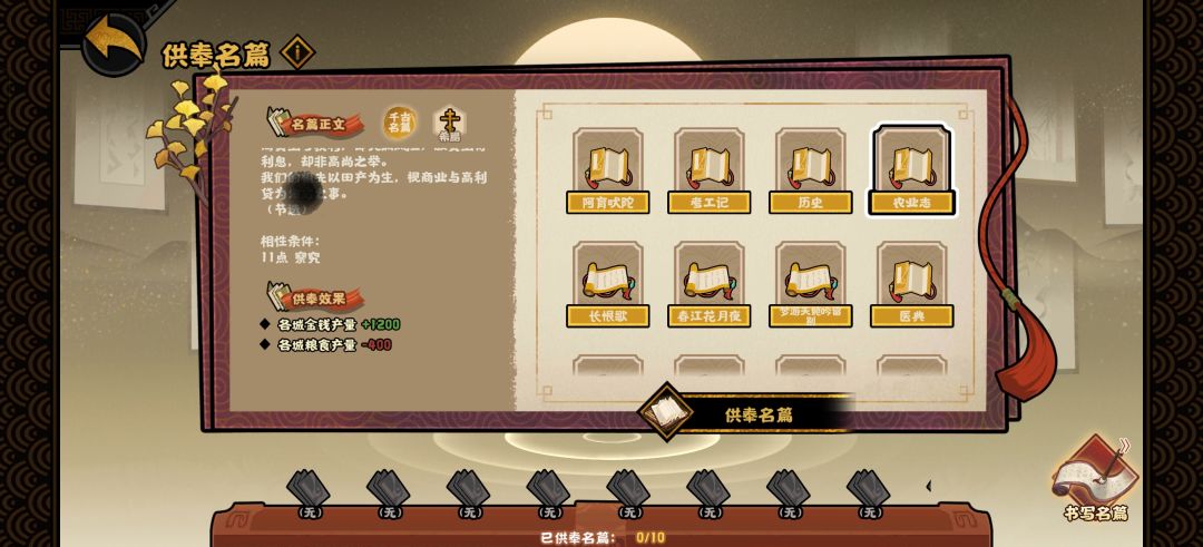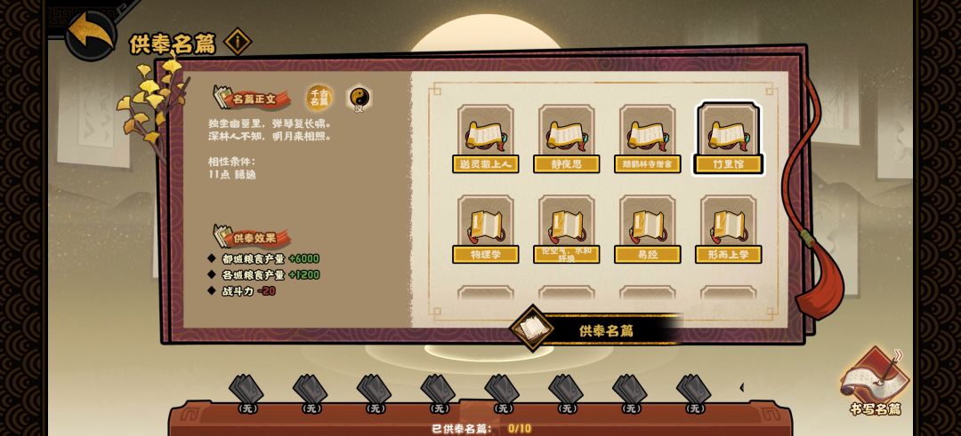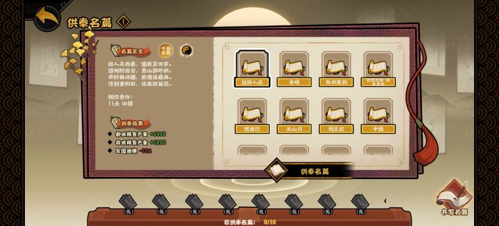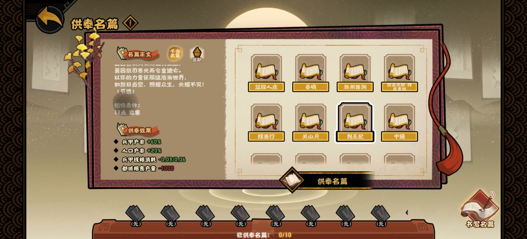 名篇的效果对应上面的两类相性,例如:+战力/-居民、兵甲增速(豪放),就是由主要相性为豪放(11豪放或8豪放+4任意第一类相性)合成出的名篇效果