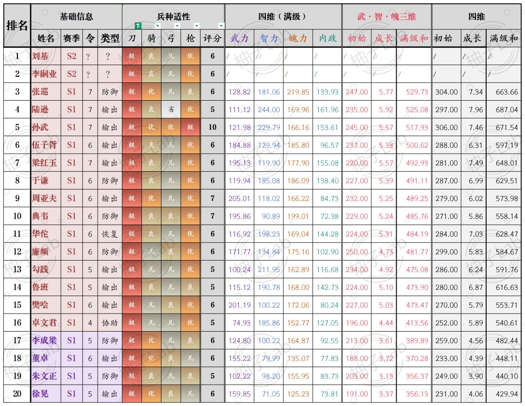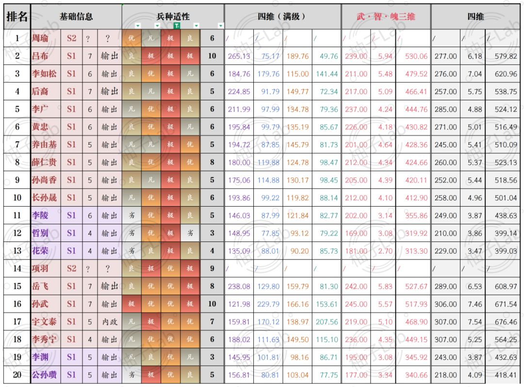 这一期我们将更深入地,从兵种适性的角度,反看过来去看看都有哪些武将适合这兵种,因此这一期的排序方法,会优先考虑兵种适性,其次在同兵种适性里,再采用三维和进行排序。希望这次的研究能帮助我们更好地理解游戏设计师们对于角色们的定位。
