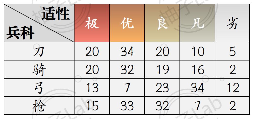 另外比较有意思的一点,不知道大家有没有发现,刀兵为“极”的武将,多数枪兵适性也为“优”及以上,而总体兵种适性评分基本处于5~6分。这里的20名将领里,包括新出的刘基和李嗣业,共有14名的枪兵适性是优。并且适性组合“极-良-凡-优”也是出现最多的,包括新赛季的2位新将领也是这个适性。所以我猜测这个应该是一个基础的“刀兵适性模板”。这里的设计思路,应该是不想让刀兵将领被骑兵将领完全克制。次属性给枪,如果对面骑兵较多,就可以时情况无缝切换成【钩镰枪】或者【藤甲兵】,针对性地进行克制。而刀兵类武将最差的适性一般是弓,这18名刀兵极的武将里,只有孙武的弓兵是优,其他最高也只有良,凡是最多的,甚至陆逊的弓是“劣”。