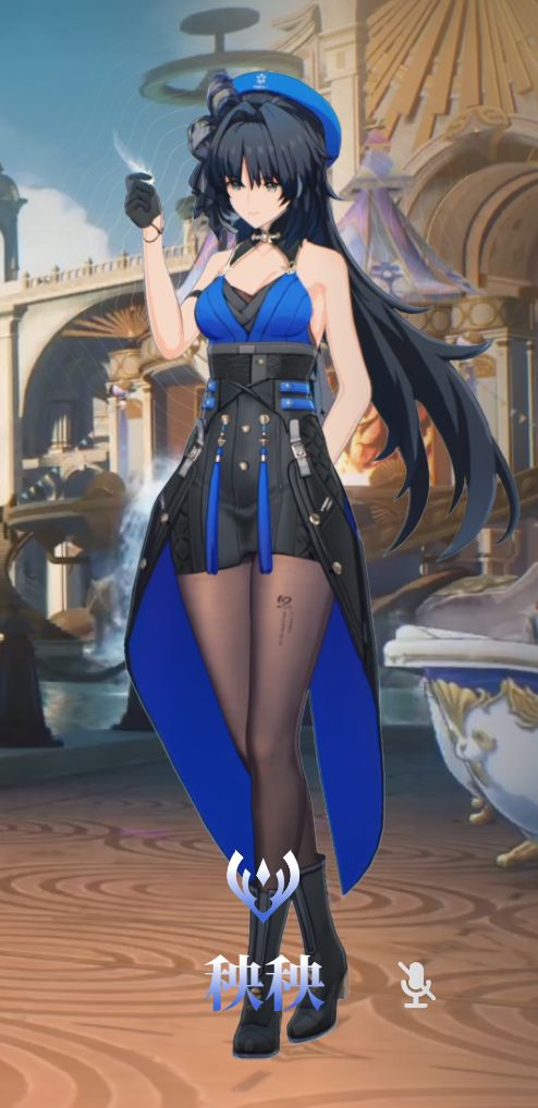 秧秧上衣设计比较素,细节少。腿部黑丝的棕色加上裙子内侧的深蓝没协调好,显得沉闷,看得让人不太舒服。