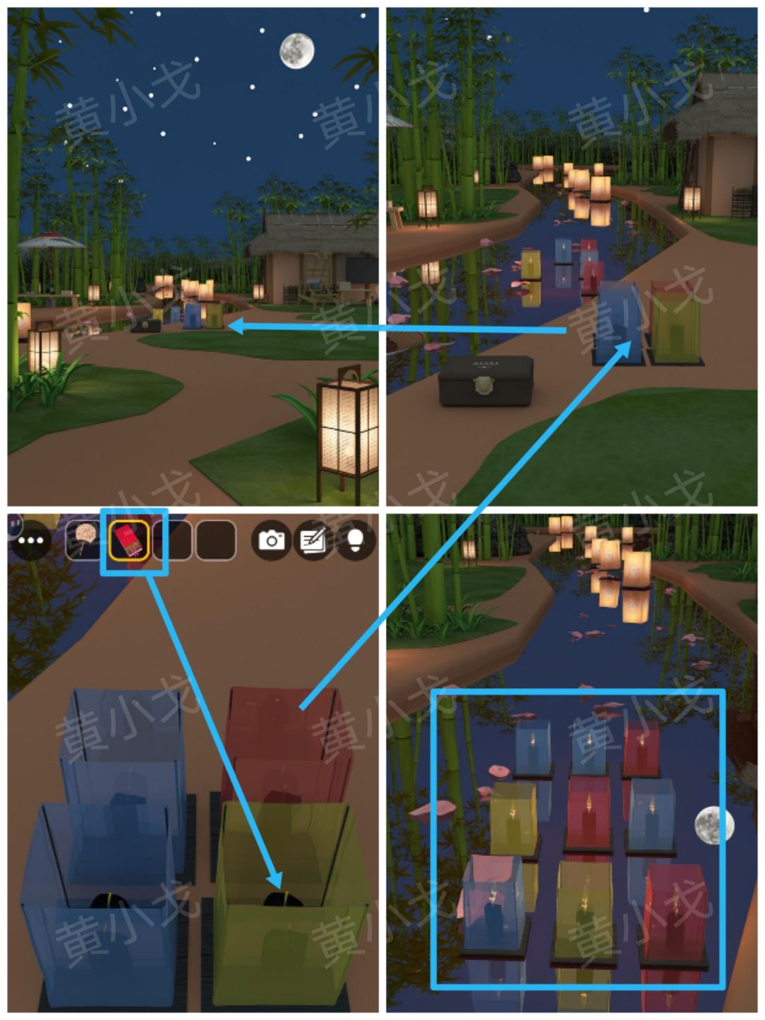 🔶[茅草屋]河灯的颜色及位置线索:蓝蓝红,黄红蓝,蓝黄红