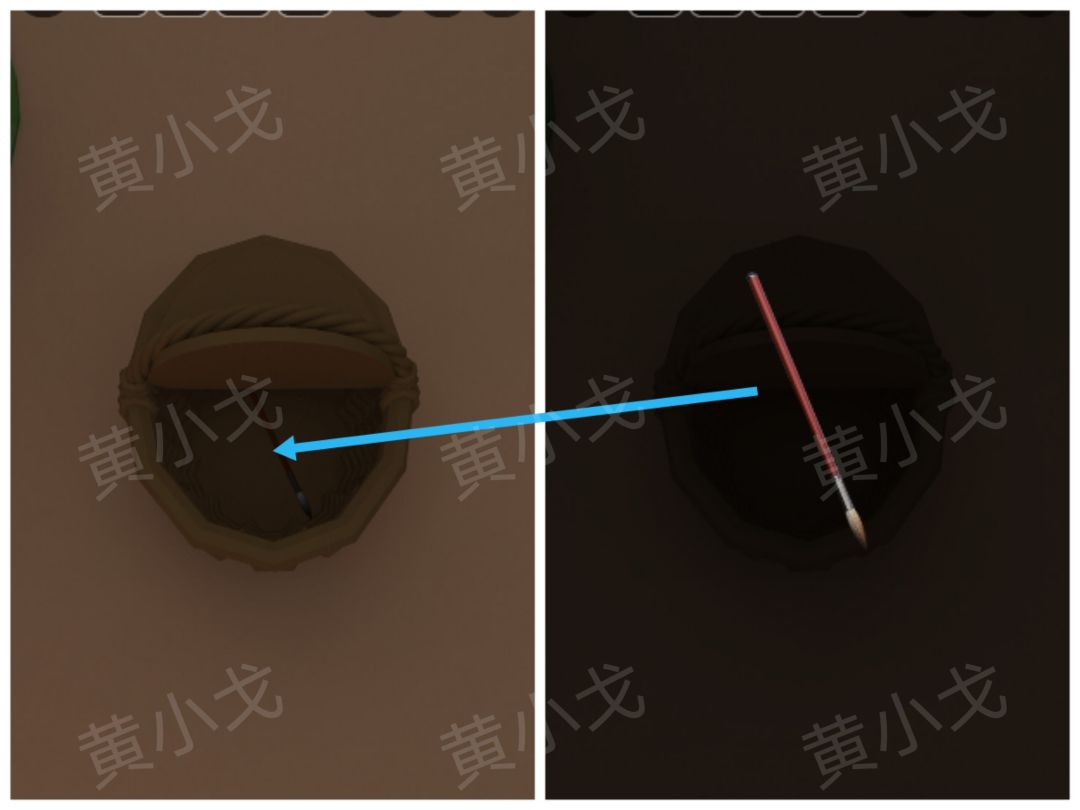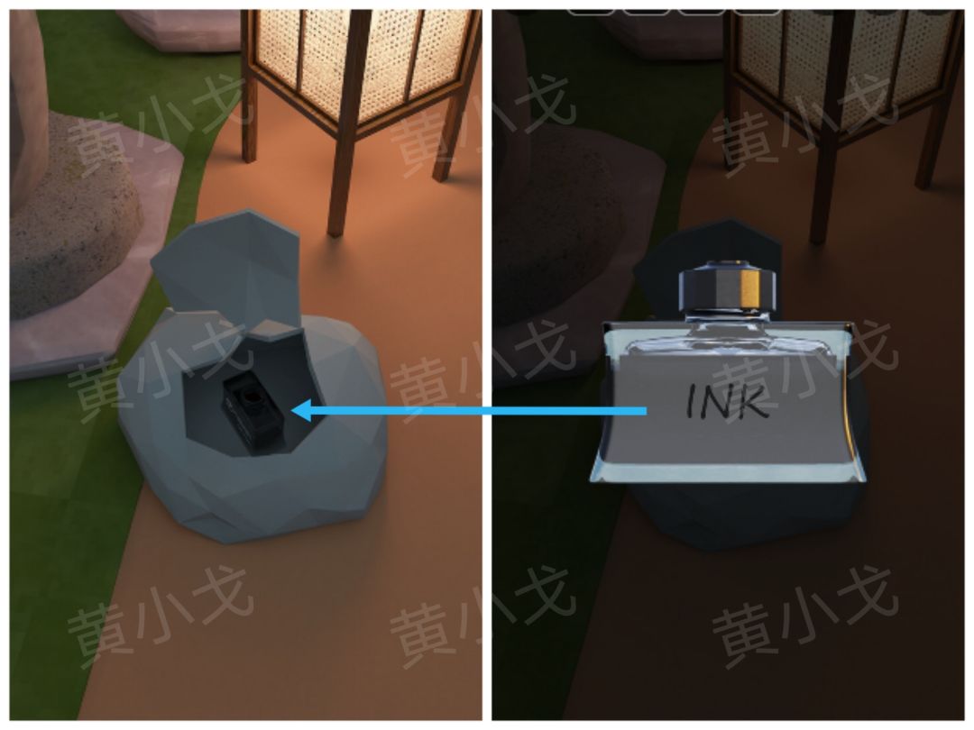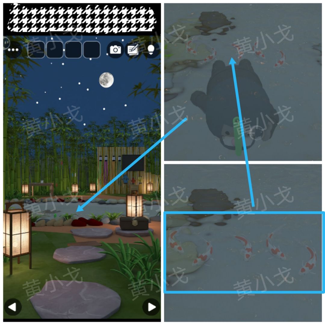 5.点击亭子外边左侧竹桶上的密码锁,根据[池子]场景池子里的鱼朝向线索,调整密码锁
