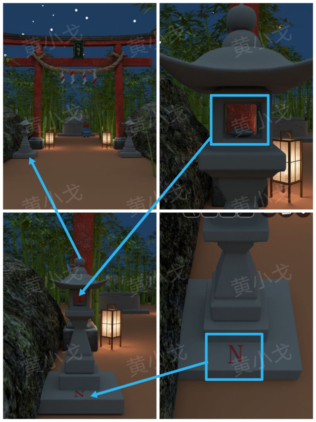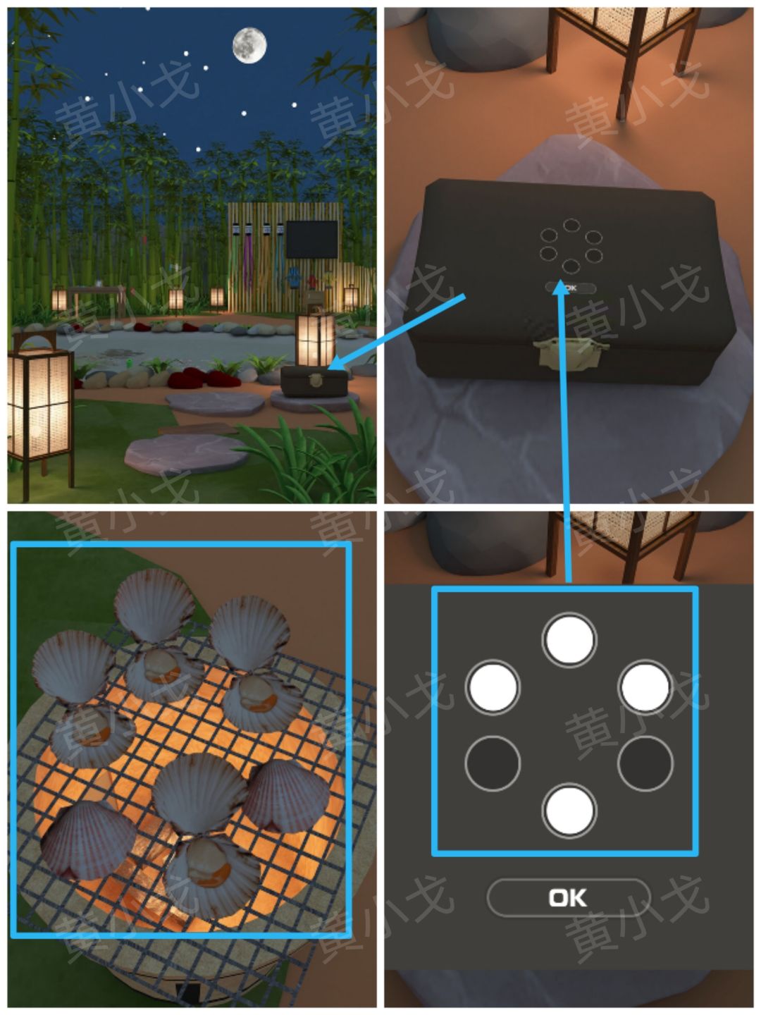 26.点击地上的箱子,根据[鸟居]场景炉子上的扇贝壳子开闭状态,调整密码锁