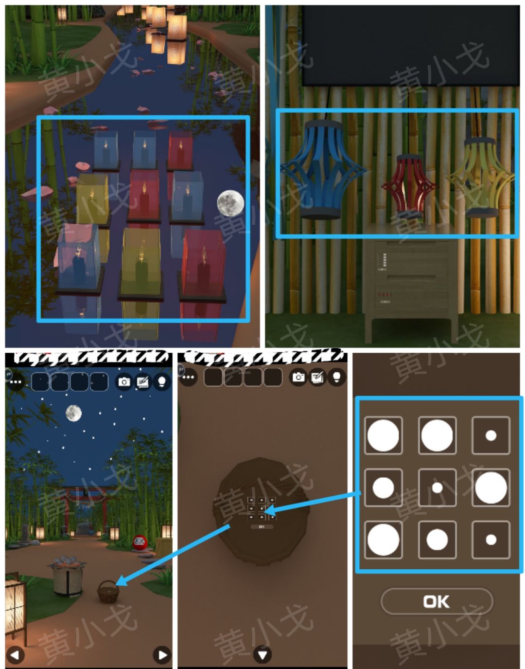 24.点击篮子上的密码锁,根据[池子]场景灯笼架线索,结合[茅草屋]场景河灯线索,调整密码锁