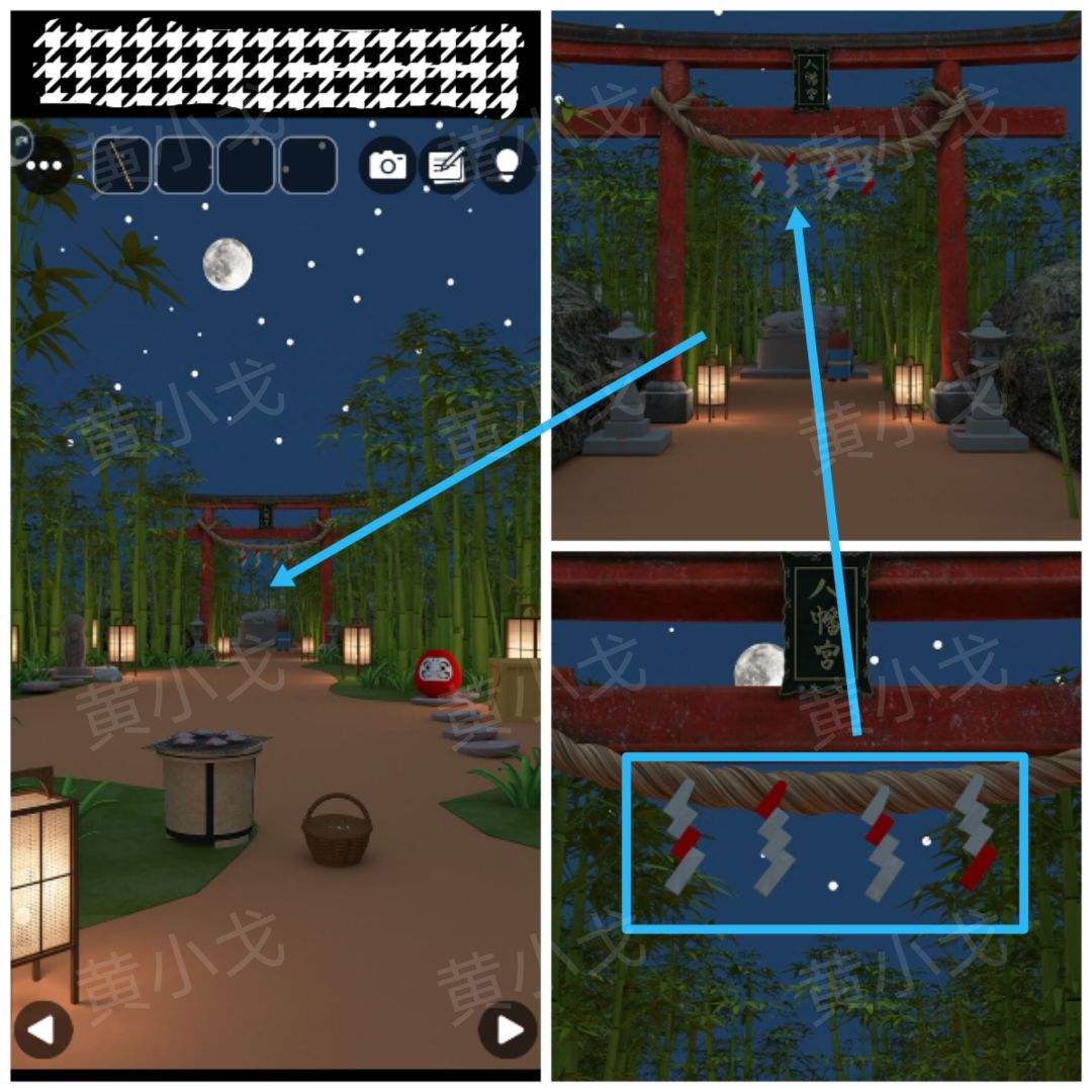 16.点击亭子外边右侧竹桶上的密码锁,根据上面的正方形大小提示,结合[鸟居]场景套娃的颜色和大小线索,调整密码锁