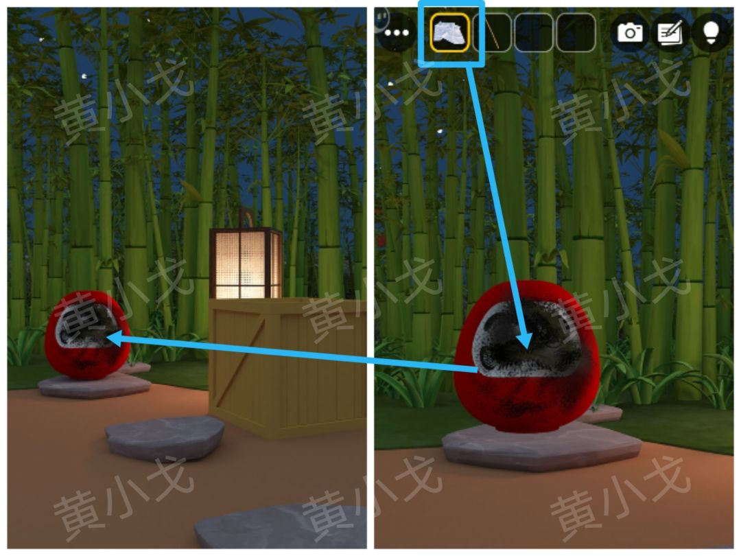 7.点击石子路旁边的木箱,根据[亭子]场景竹子高度线索,调整密码锁