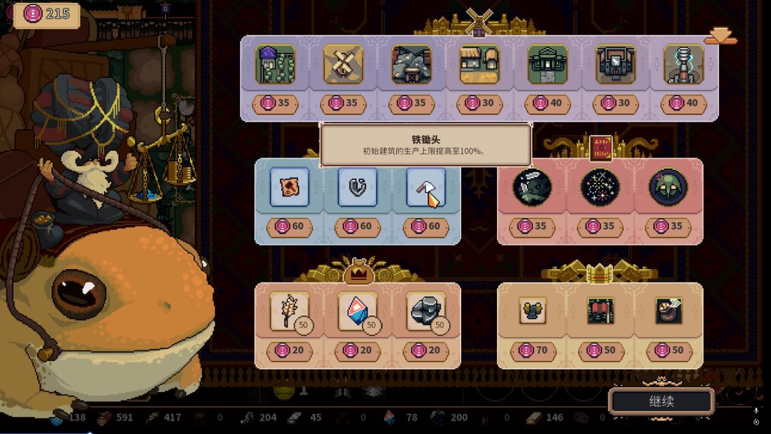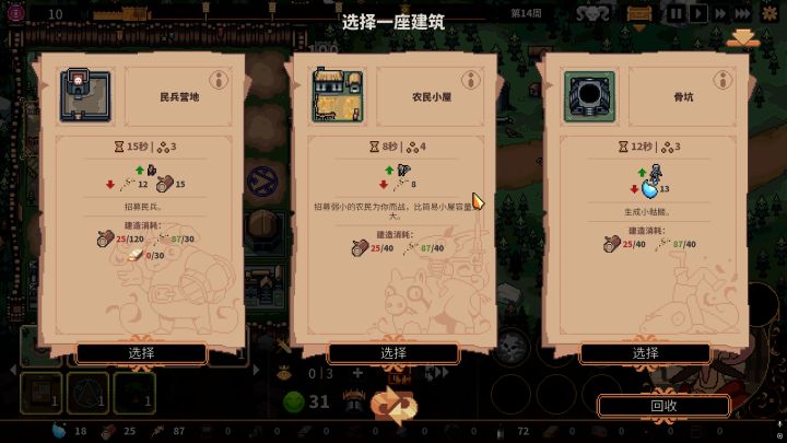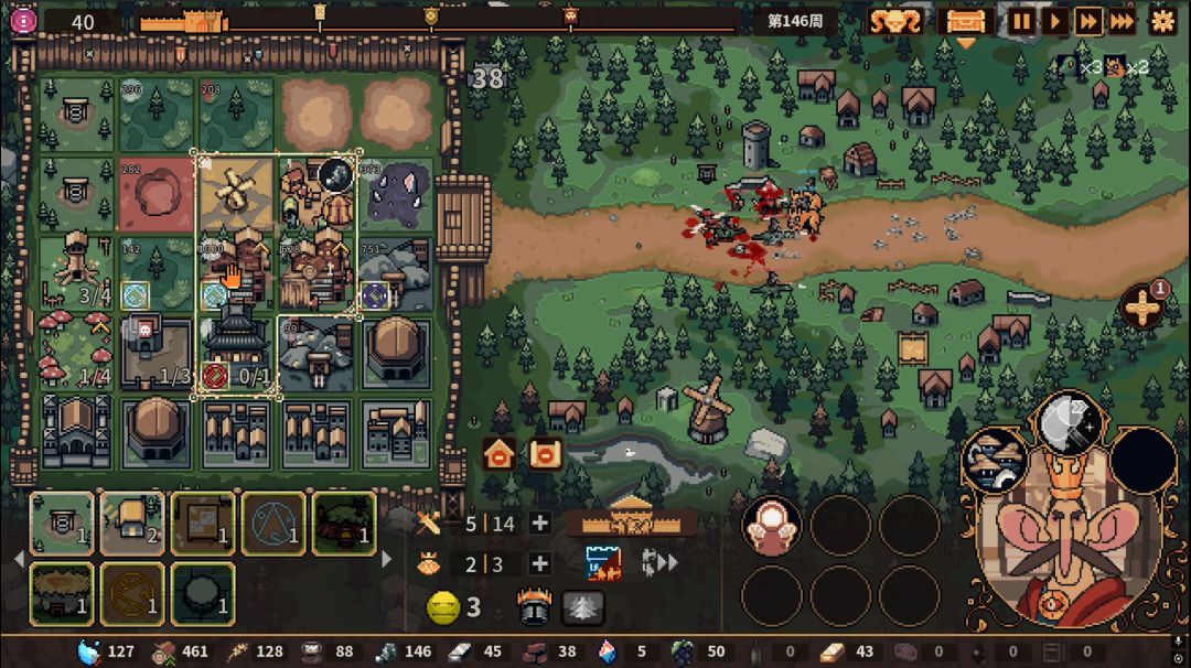 )。故此,我们在游玩时需要动态调整监视重点:农田需稳定产粮,兵营需爆兵打人,而资源链(如金矿、水晶)的分配将直接影响王国兴衰。如何合理安排建筑,屯粮爆兵,在自己选择的压力强度下生存升级、抵御boss攻势,都需要我们一点点摸索,从最开始的手忙脚乱到三战boss的从容不迫,游戏本身带来我们的成就感也非同小可。
