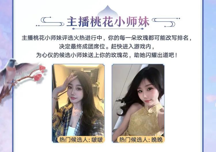 在官方直播平台,各位主播桃花小师妹凭借出色的直播表现,正火热角逐本次评选,究竟哪位小师妹能闪耀出道?让我们共同期待!