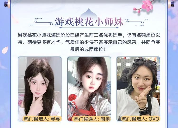 经过这段时间的海选,活动终于迎来了最重要的时刻——三大赛道高手云集,小师妹们各显神通,从众多参与者中脱颖而出。此刻,请为你心仪的游戏桃花小师妹投下至关重要的一票!