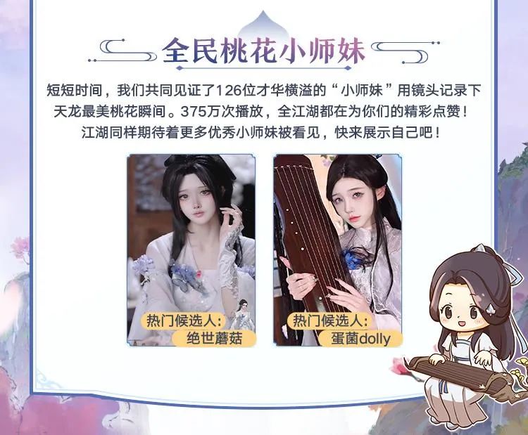 在短短时间里,我们共同见证了126位才华横溢的小师妹,用镜头定格了天龙江湖中最美的桃花瞬间。用375万次播放证明,全江湖都在为这份精彩点赞!