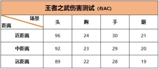 王者之武同大多数王者武器一样,具备不俗的伤害,而且伤害衰减并不明显,命中躯干伤害数值只减少了1个点,在实战中对枪不落下风,中、近、远距离数值相差不大,比较适合点射。