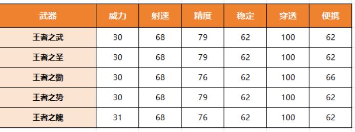 在基础属性面板,王者之武和王者之圣及王者之势具备同样优秀的基础数值,相较于王者之勠和王者之魄的精度还要高出很多,在一众常见的王者武器面前不落下风,虽然王者之武的存在感不强,但千万不要轻视这把枪的威力。