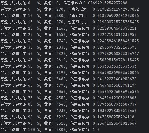 可以看到,穿透为防御力的95%时就已经损失了将近75%的伤害!换言之,此时只需要提高5%的穿透,就可以提升整整4倍伤害!