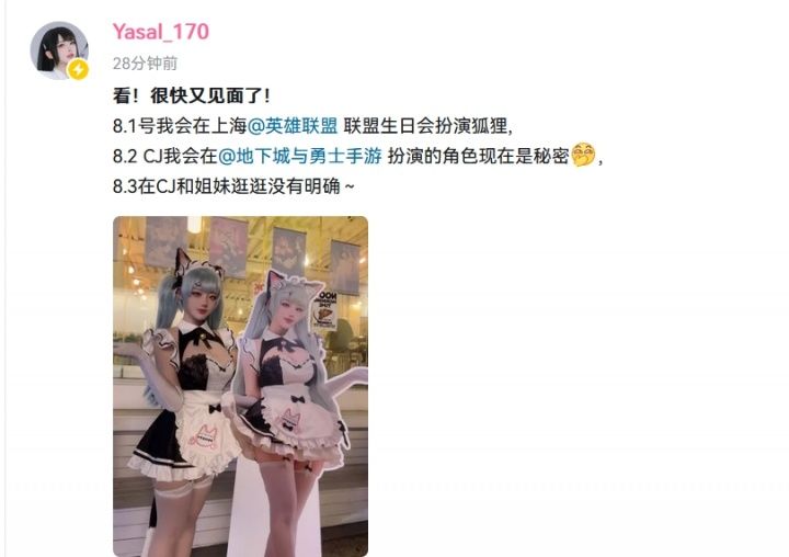在BW展爆火的韩国Coser yaral今日更新动态,表示将会在8月初再度来到中国,将在英雄联盟生日会上再度扮演狐狸!