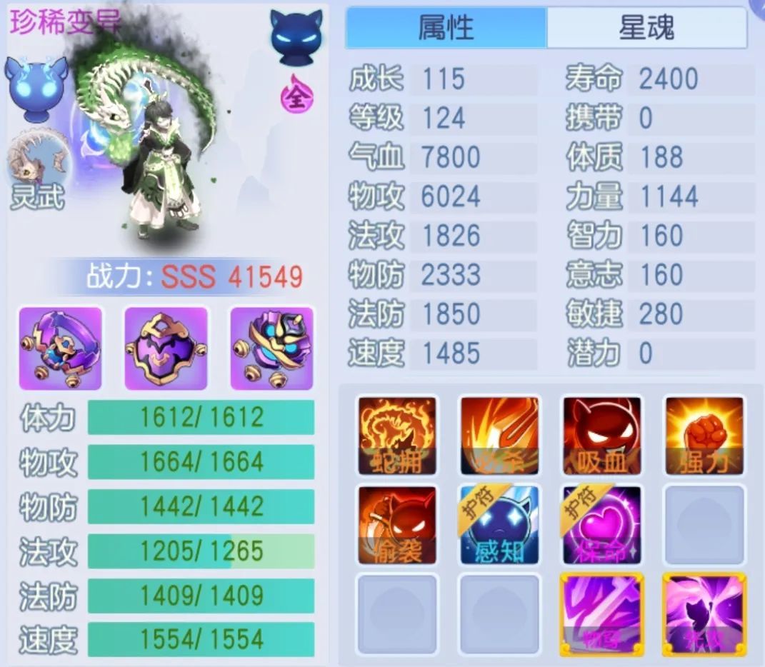 宠物技能蛇拥 + 超级必杀 + 超级偷袭 + 超级吸血 + 超级强力 + 高级物穿 + 高级先攻,护符为高级保命 + 感知技能搭配近乎完美,但核心超级技能尚缺两个,建议强化。感知技能可替换为逆机,效果更佳。