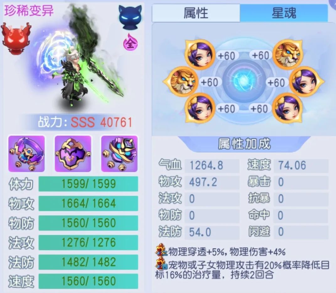 星魂属性以物攻、速度为主,契合宠物需求,但全部为紫色品质,升级为橙色后属性将大幅提升。套装为大圣×4 + 九尾×2,提供极致物理伤害提升,任务中最高伤害加成可达16%,表现强劲。