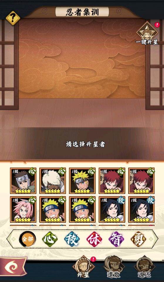升星的规则是,5星忍者升星后,为红色1星(即6星),红色5星升星后,为银色1星,银色5星升级后,为黄金1星,黄金5星升级后为彩色1星,目前最大只能升星至彩色2星