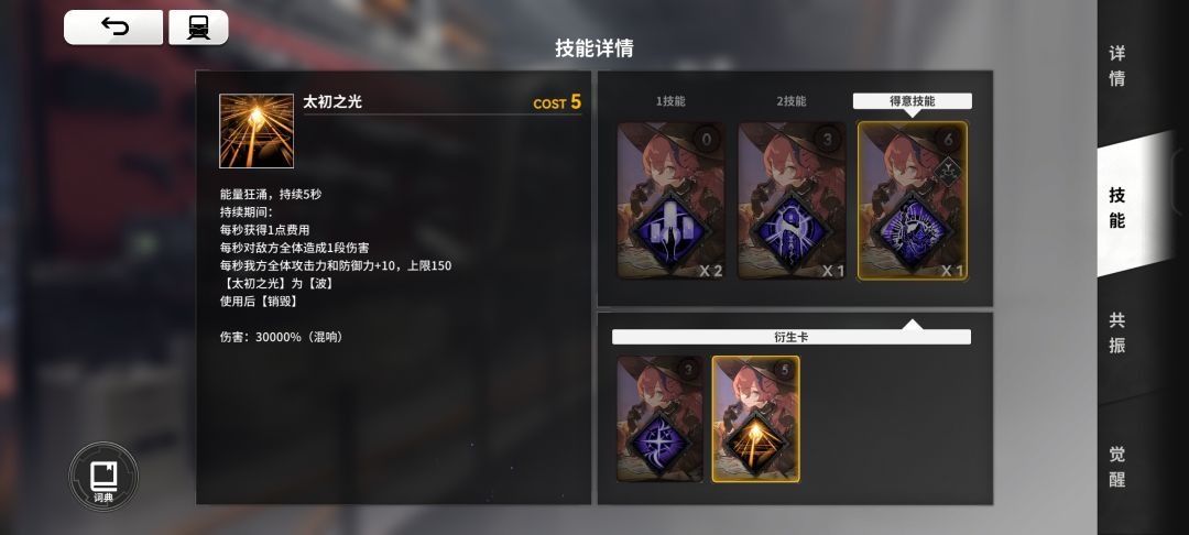 共振一二提高自身数值,四能为全队恢复血量,五是关键技能,能融合太初之光