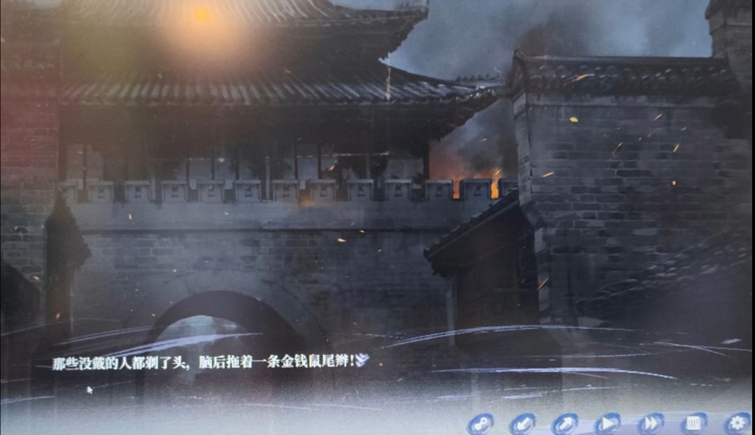 在哀鸿有一章有会有一道选择,选择的大体内容是给不给一个乞丐钱,如果给的话,至少不会砍头。在文本中比饿殍的文本有很大提升, 在哀鸿开头,也就是比较熟悉的扬州聚餐,也就是王秀楚请客,之后再用苏怜烟来引出方知宥的兽视症,再通过王生与官兵的对话了解这个兽视症是怎么来的,剧情非常衔接爽滑。要讲的设定也都讲出来了。