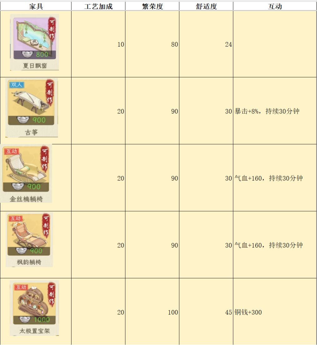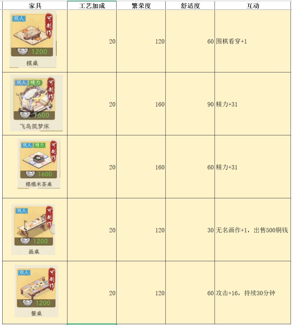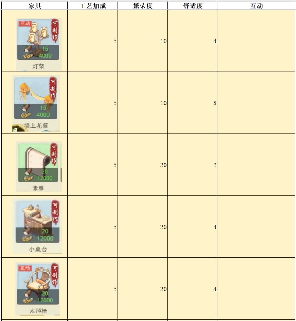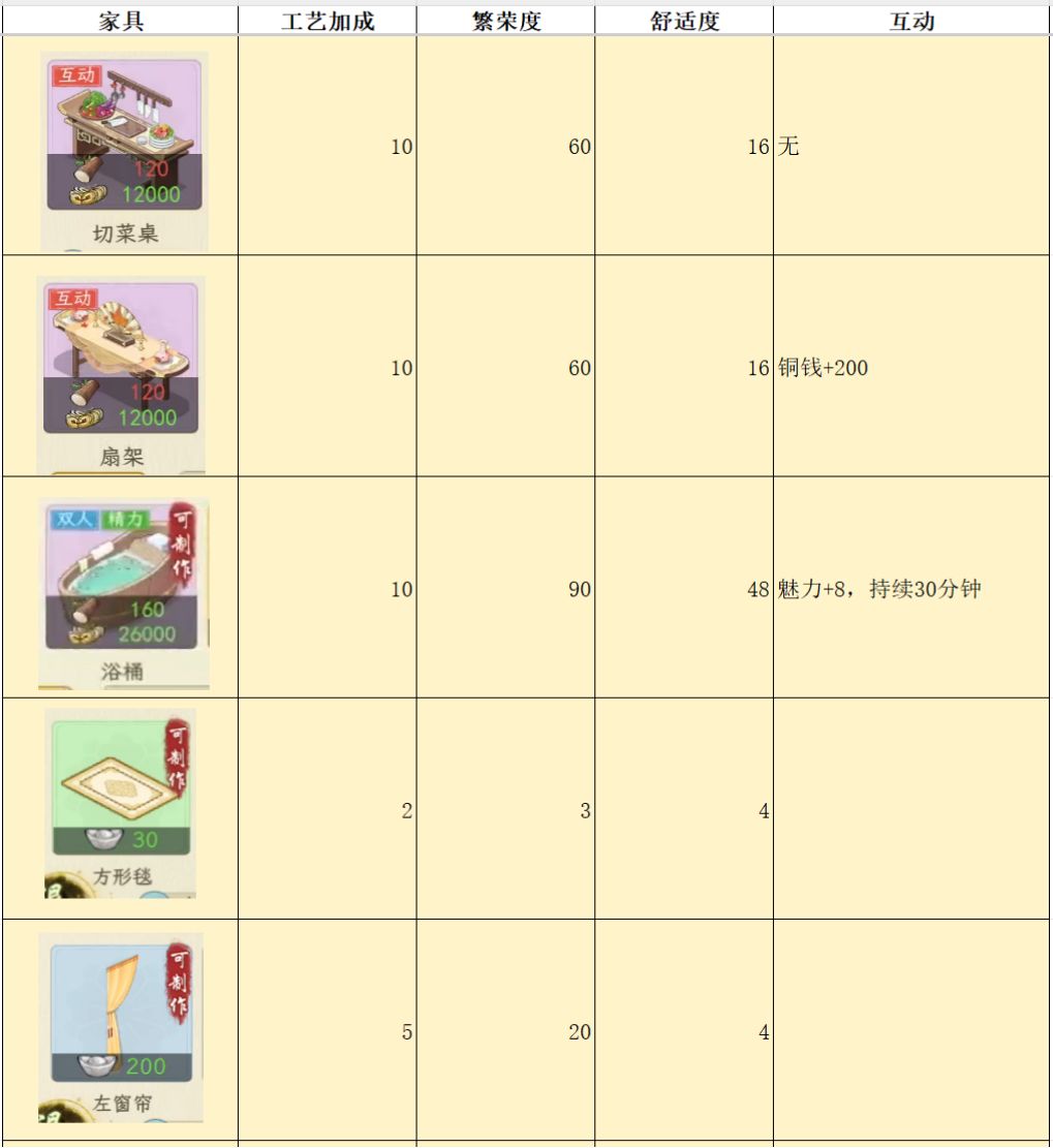 测试家具,主要是为了对比各个家具属性,来看看哪个家具性价比最高,例如相同的耗材,木桌增加的舒适度是8,其他家具基本是2-4。