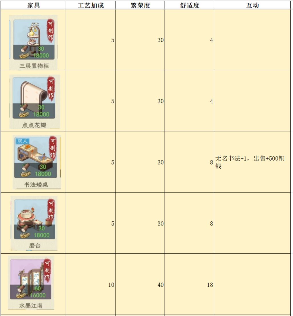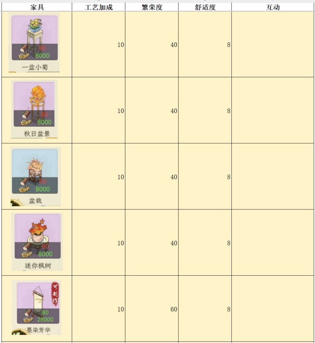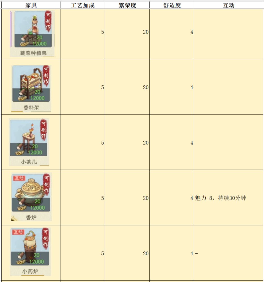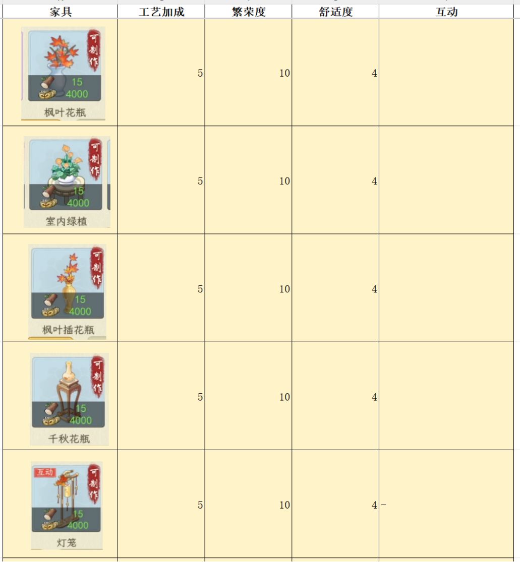 测试家具,主要是为了对比各个家具属性,来看看哪个家具性价比最高,例如相同的耗材,木桌增加的舒适度是8,其他家具基本是2-4。