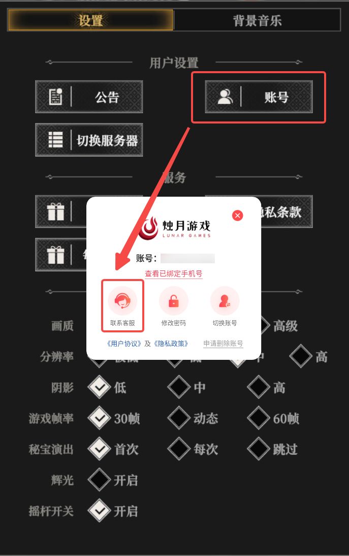 方式1:游戏内在设置界面,点击【账号】,即可看到客服入口。