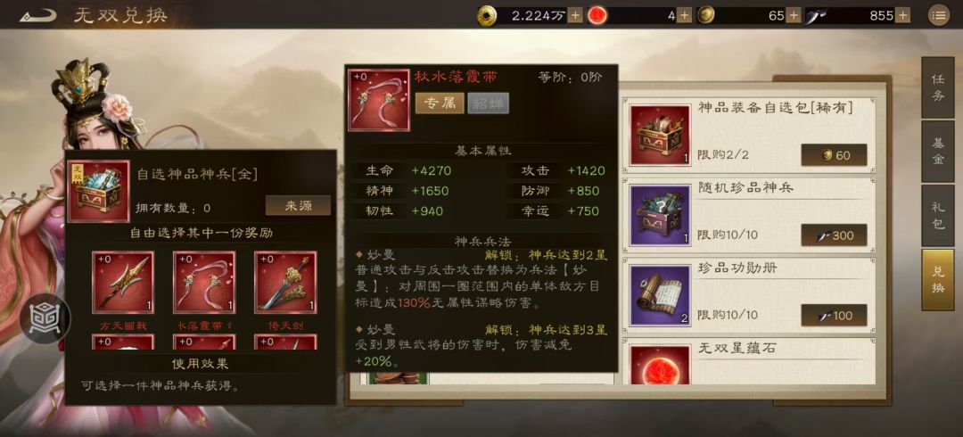神兵对于PVE的提升很小,三星的话对PVP提升较大,四星词条完整100%,五星只强化了前面的词条数值。对于平民来说,玩貂蝉可以不用神兵,氪佬依旧拉满,防止竞技场貂蝉暴毙,从而让其在接下来的战斗中发挥更长的辅助作用。