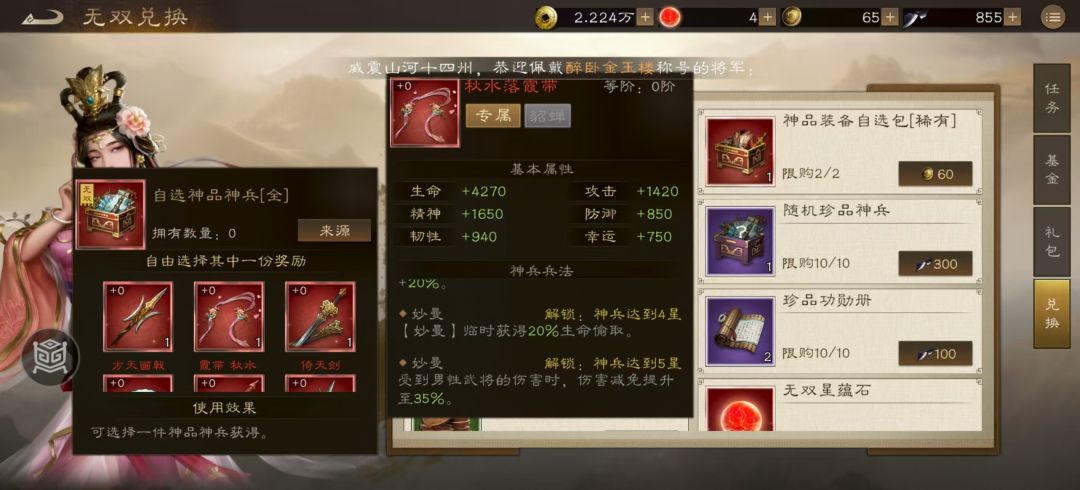 神兵提升的重点摘要:普攻反击增伤,吸血,男性伤害减免。